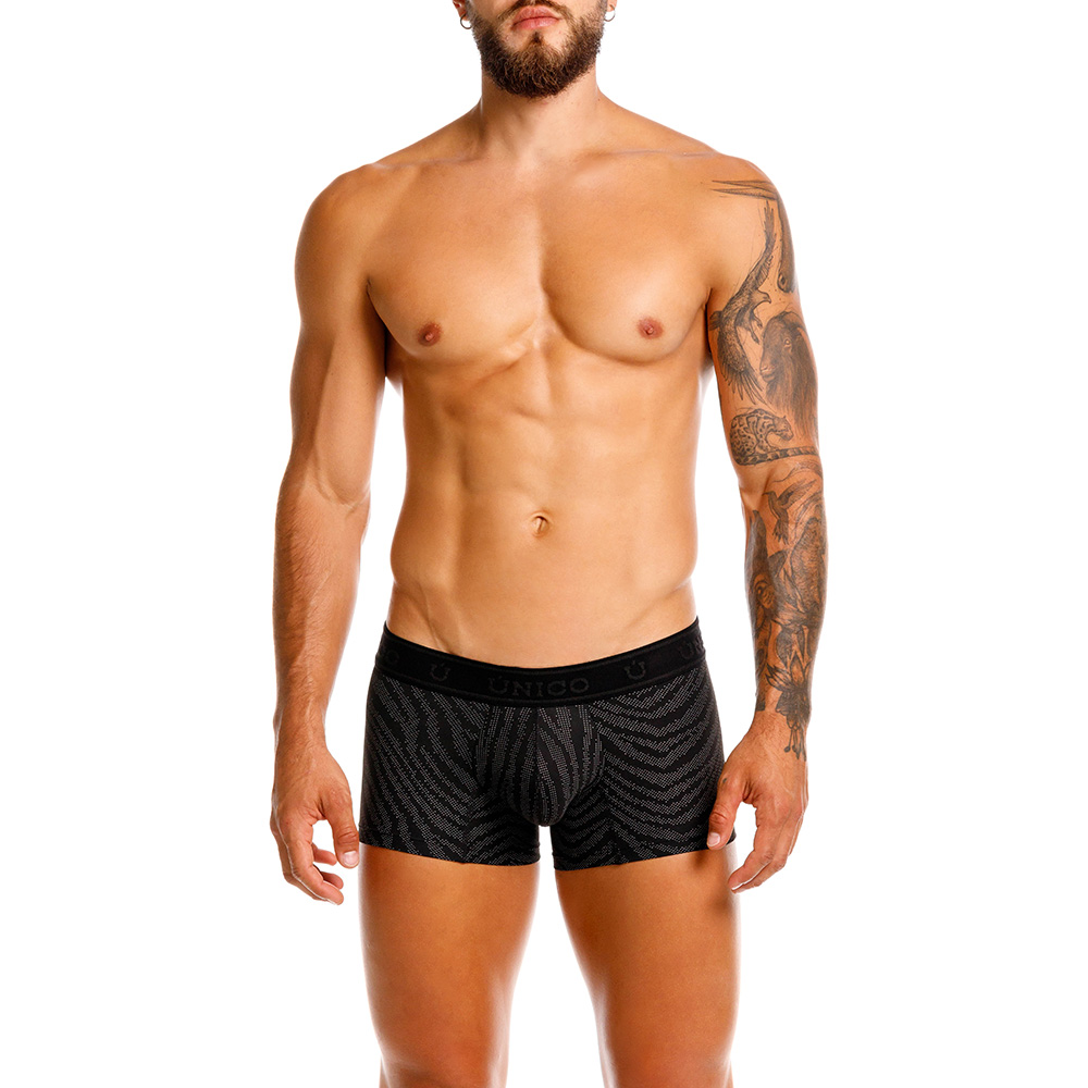 ÚNICO präsentiert das Modell Zelmur– ein fein gewebter Jacquard mit elegantem Animal Print. Der elastische Bund mit eingewebtem Schriftzug und Logo vollendet das Ton-in-Ton designte Modell mit einem stilvollen Akzent. ÚNICO steht für höchsten Tragekomfort dank anatomisch geformtem Suspensorium. Hochwertige Materialien und präzise Verarbeitung versprechen Qualität und Langlebigkeit.