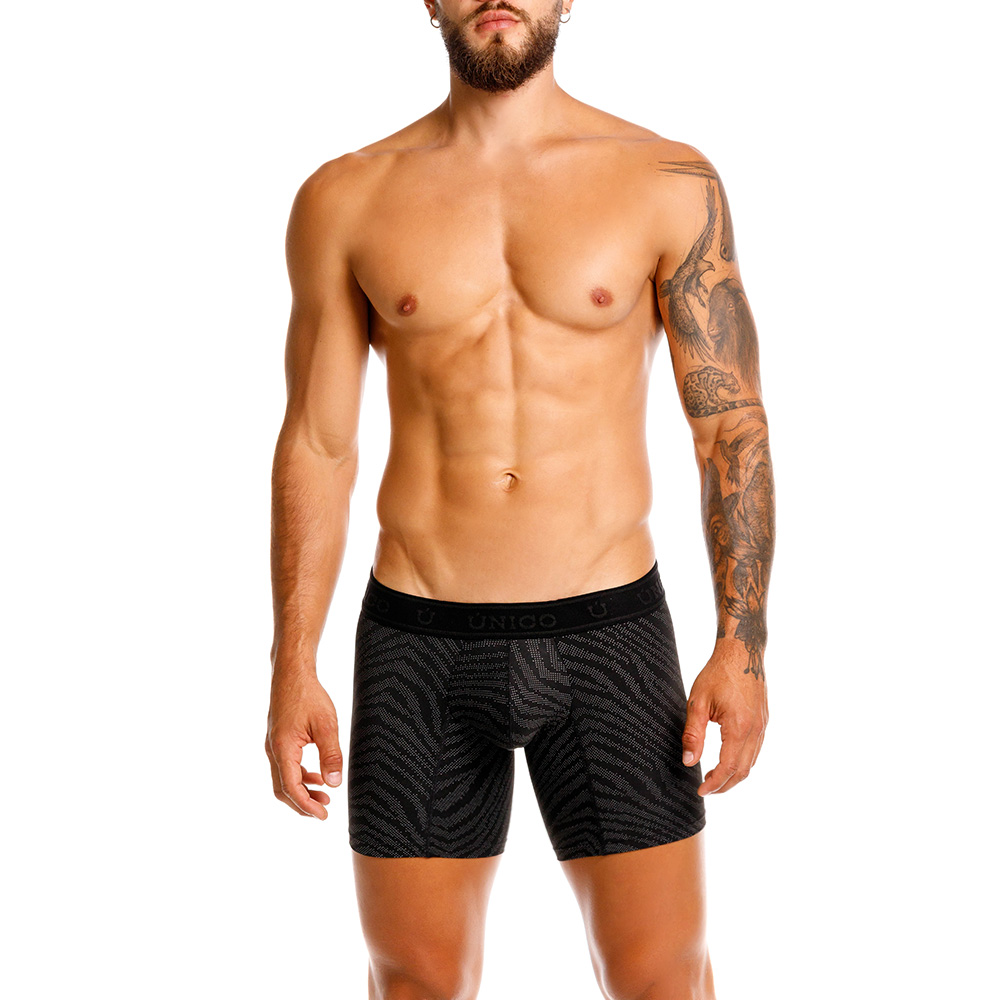 ÚNICO präsentiert das Modell Zelmur– ein fein gewebter Jacquard mit elegantem Animal Print. Der elastische Bund mit eingewebtem Schriftzug und Logo vollendet das Ton-in-Ton designte Modell mit einem stilvollen Akzent. ÚNICO steht für höchsten Tragekomfort dank anatomisch geformtem Suspensorium. Hochwertige Materialien und präzise Verarbeitung versprechen Qualität und Langlebigkeit.